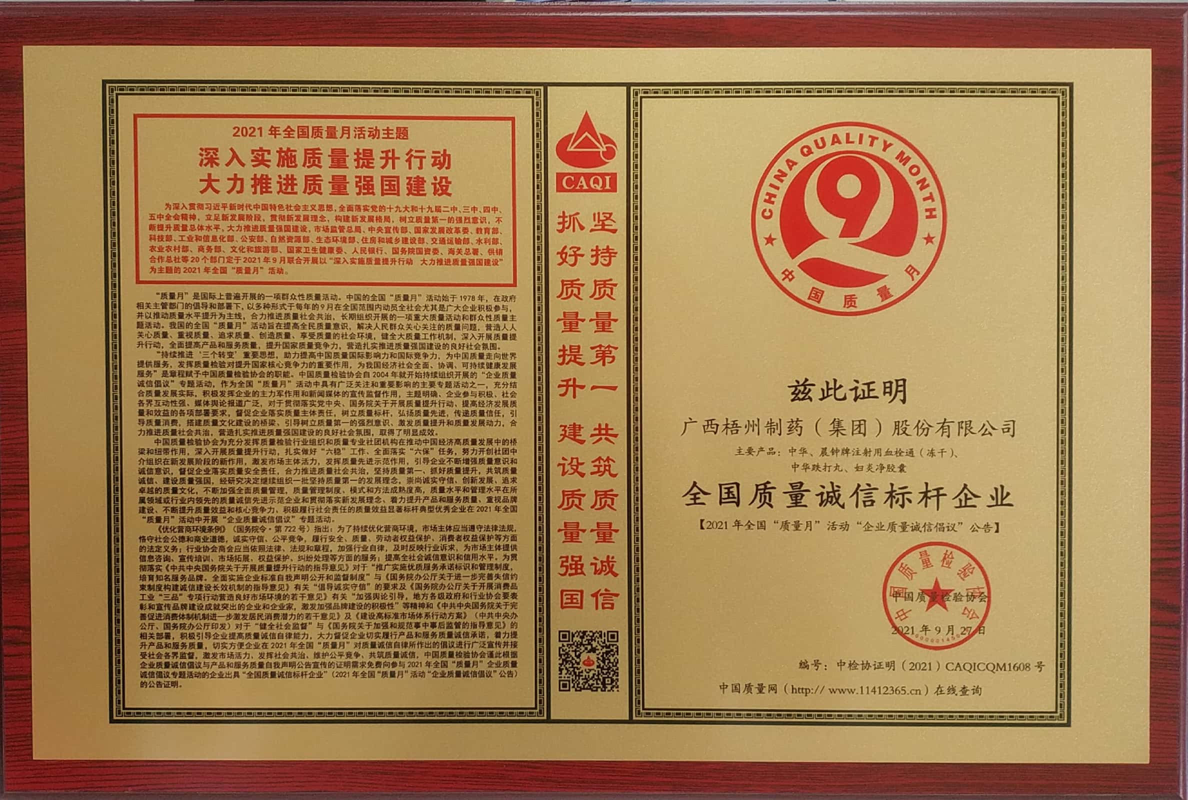 在2021年全國"質(zhì)量月"活動中榮獲 全國質(zhì)量誠信標桿 企業(yè)稱號。