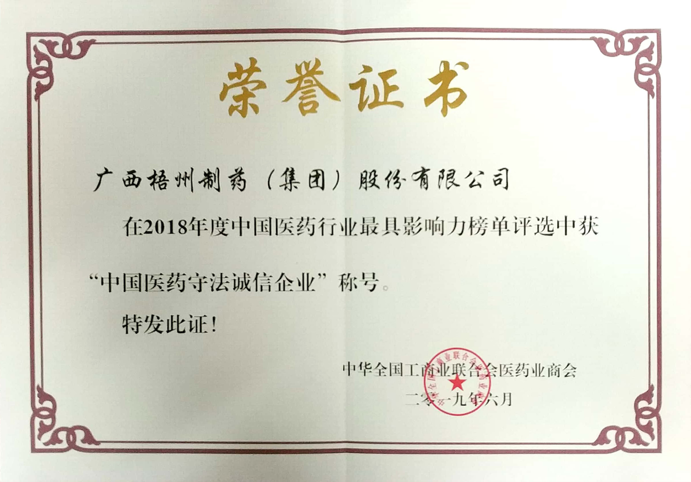 在2018年度中國(guó)醫(yī)藥行業(yè)最具影響力榜單評(píng)選中獲“中國(guó)醫(yī)藥守法誠(chéng)信企業(yè)”稱號(hào)。