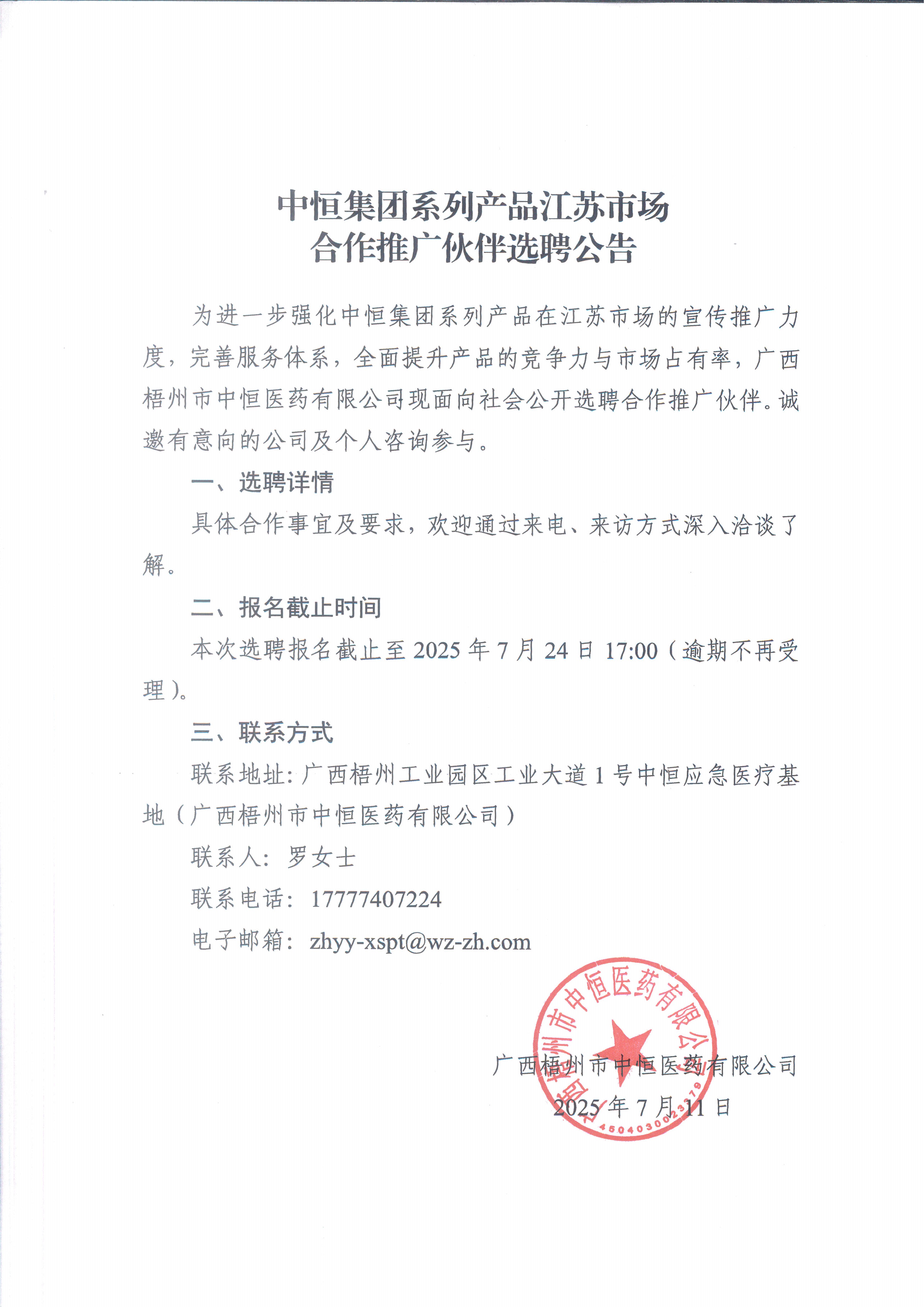 中恒集團系列產品江蘇市場合作推廣伙伴選聘公告