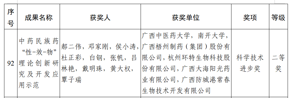 7月4日,2024年度廣西科學技術(shù)進步獎獲獎名單正式公布,廣西梧州制藥(集團)股份有限公司參與的《中藥民族藥“性-效-物”理論創(chuàng)新研究及開發(fā)應(yīng)用示范》項目榮獲廣西科學技術(shù)進步獎二等獎。獲獎項目由大學院校和企業(yè)聯(lián)合完成,旨在通過創(chuàng)新的理論研究,揭示中藥和民族藥的藥效物質(zhì)基礎(chǔ),提升傳統(tǒng)藥物的現(xiàn)代化水平,梧州制藥作為該項目的第三完成單位,彰顯了其在中藥現(xiàn)代化研究領(lǐng)域的實力。