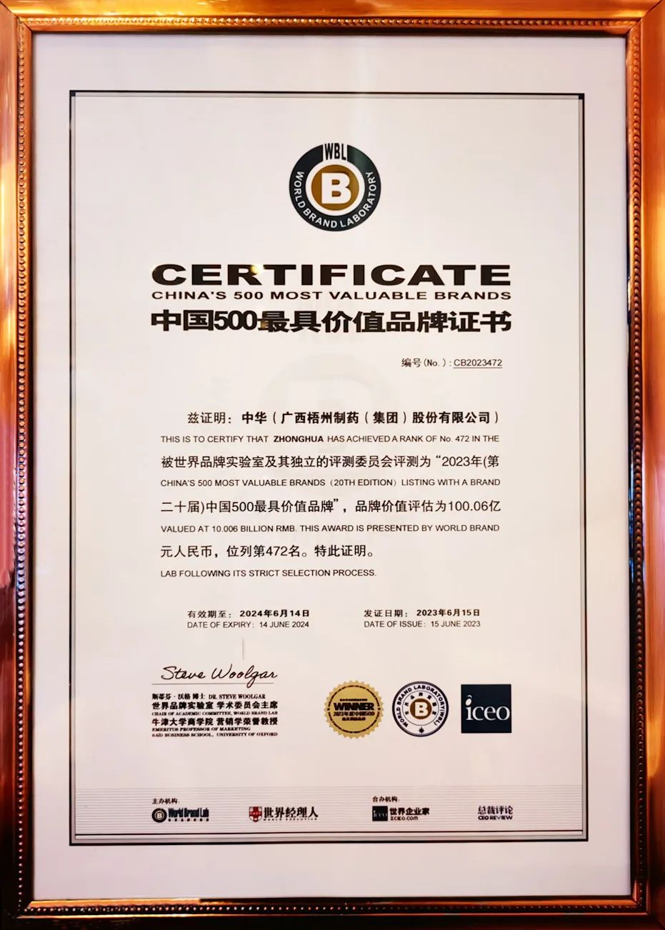 中華跌打丸為梧州制藥獨家生產(chǎn)品種,自1966年批準生產(chǎn)至今已經(jīng)臨床應(yīng)用五十余年,先后收錄于2005版、2010版、2015版、2020版、2025版《中國藥典》,憑借其顯著的消腫止痛、舒筋活絡(luò)、止血生肌、活血祛瘀功效,在骨科治療領(lǐng)域深受認可。曾獲國家醫(yī)藥管理總局優(yōu)質(zhì)產(chǎn)品獎、中華人民共和國國家質(zhì)量獎銀獎等榮譽稱號,核心發(fā)明專利榮獲中國專利優(yōu)秀獎,廣西發(fā)明創(chuàng)造成果展覽獎。其產(chǎn)品商標是目前我國醫(yī)藥領(lǐng)域唯一一個獲準使用的“中華”商標,2023年“中華”品牌入選世界品牌實驗室發(fā)布的“中國500最具價值品牌”榜單,品牌價值評估超100億元,為當年度廣西唯一入選該榜單的醫(yī)藥品牌。